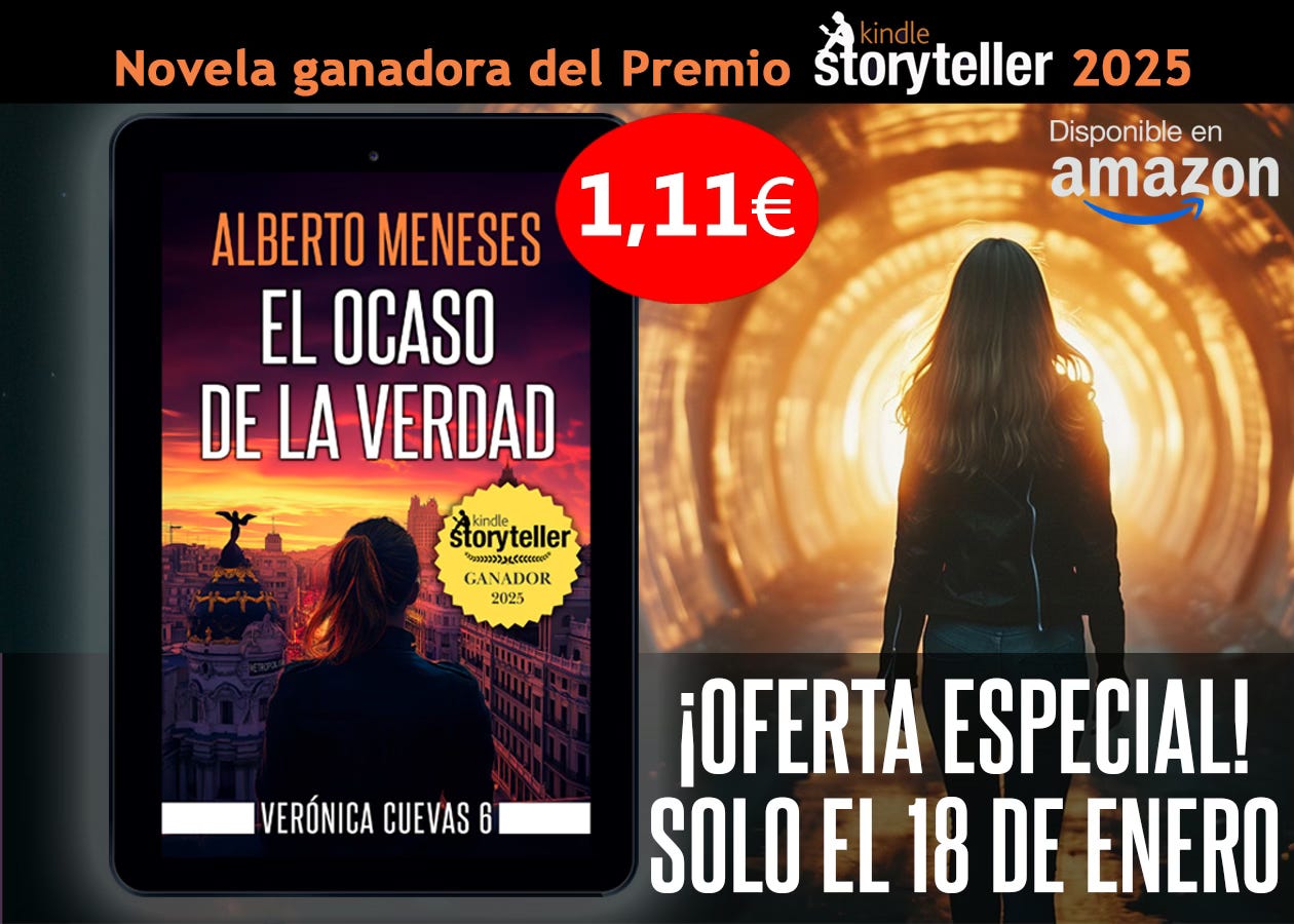 Hoy está en oferta EL OCASO DE LA VERDAD, la sexta novela de la serie Verónica Cuevas y novela ganadora del Premio Kindle Storyteller 2025, al precio más bajo que podrás encontrar.